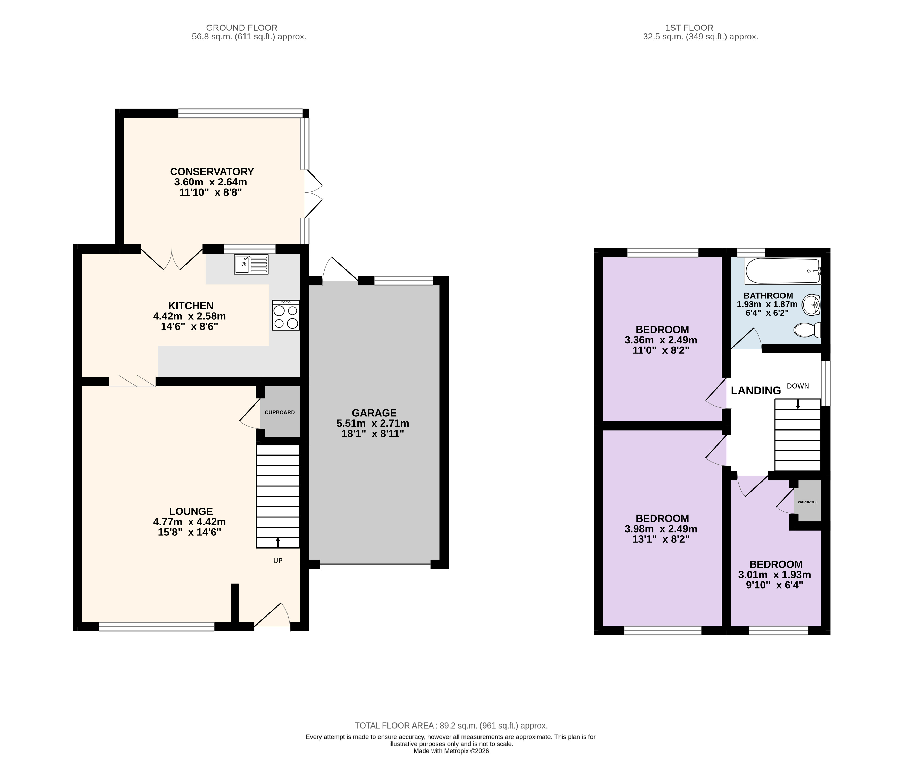 The ground floor opens into a welcoming entrance hall that leads through to a generously sized lounge, ideal for relaxing in the evenings or hosting friends and family. The kitchen is practical and thoughtfully arranged, fitted with ample cupboard space and integrated appliances, providing plenty of room for both cooking and everyday dining. To the rear, a bright conservatory adds a flexible additional living area, suitable for use throughout the year.