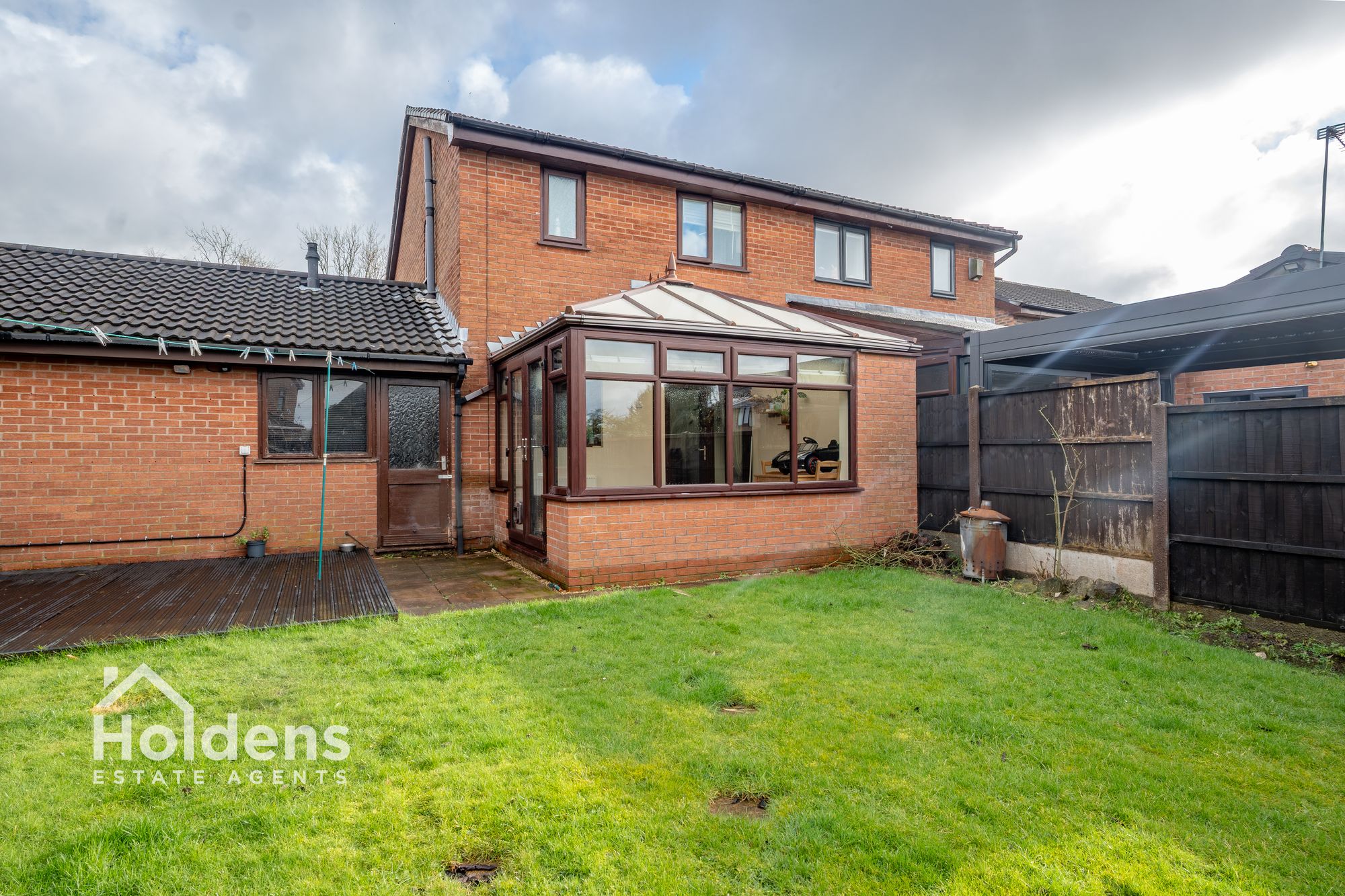 Externally, the property has been arranged for ease of maintenance. A driveway at the front provides off-road parking and leads to a single garage, ideal for secure parking or additional storage. The enclosed rear garden features decking and lawn, creating a practical outdoor space for dining, children’s play, or relaxing in warmer weather. The conservatory opens directly onto the decking, allowing for a natural extension of the living space during the summer months.