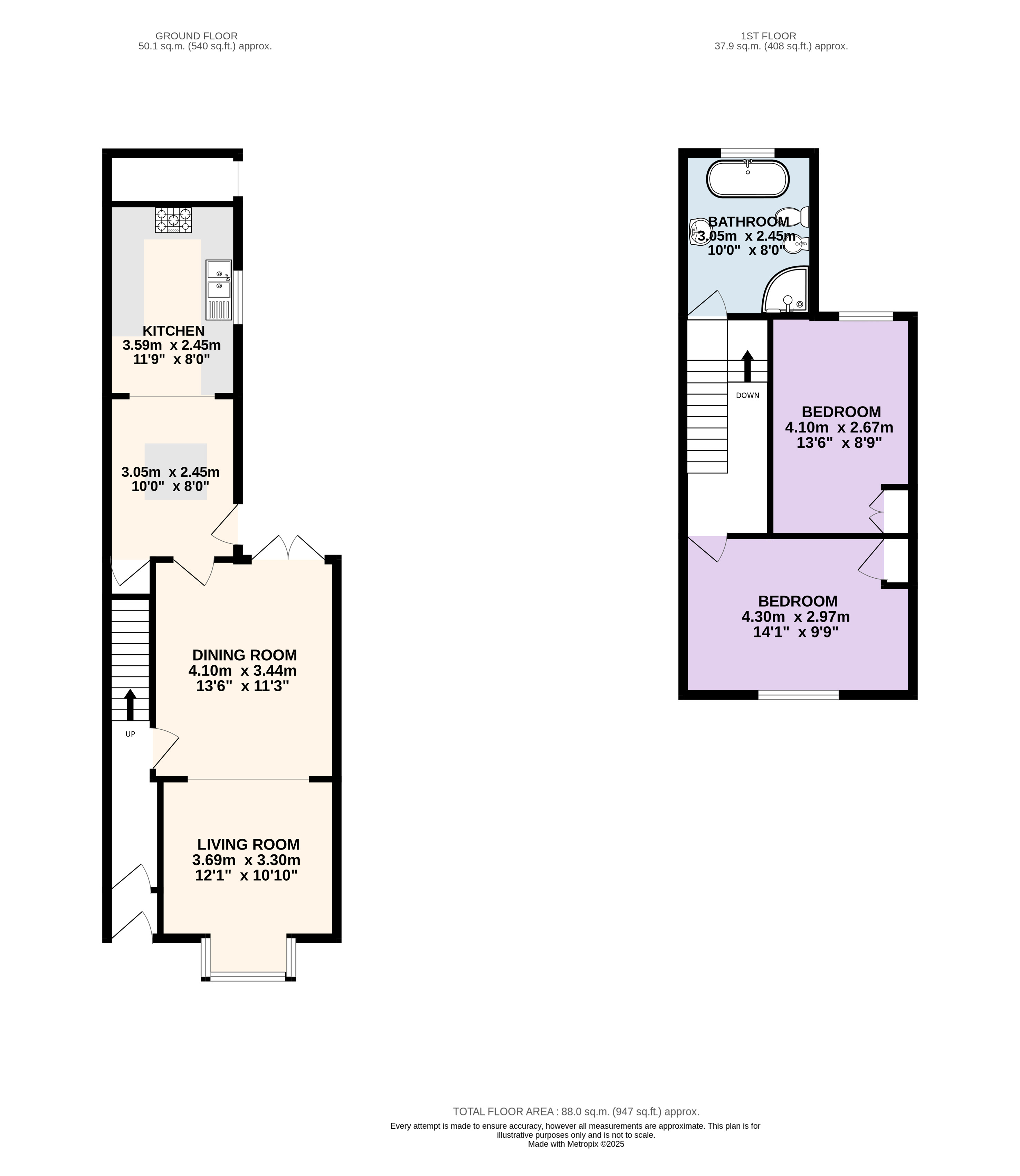 Upstairs you’ll find two well-proportioned double bedrooms and a stunning five-piece family bathroom fitted with designer fixtures, a walk-in shower, freestanding bath, and underfloor heating for added comfort.