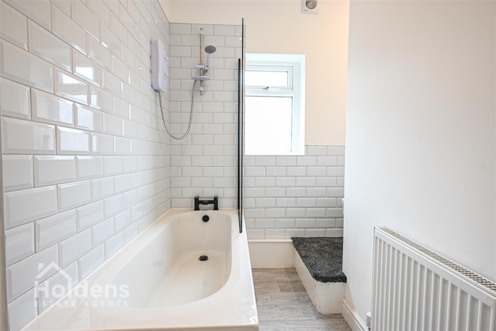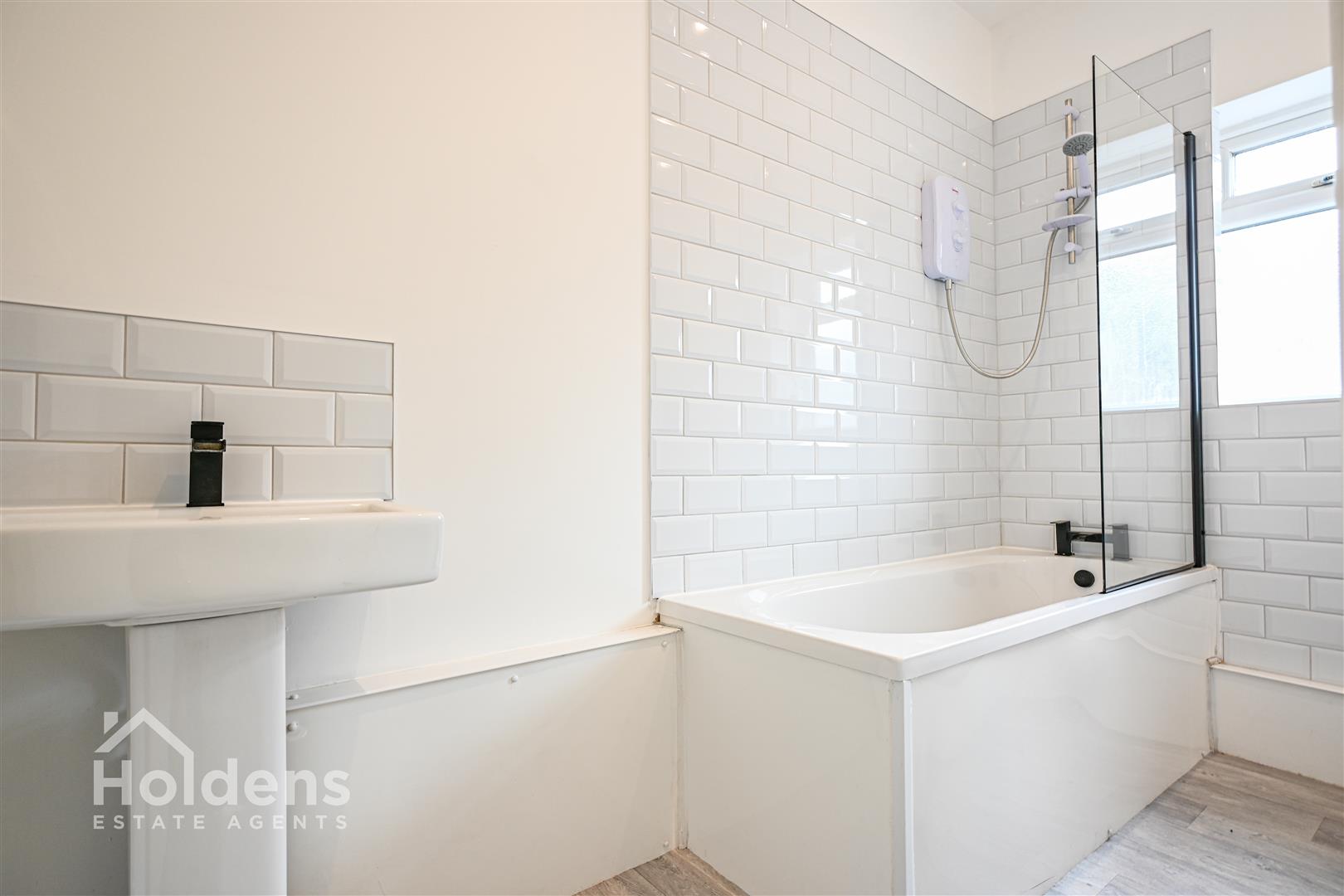 UPVC double glazed frosted glass window to rear, laminate flooring, radiator, recessed spotlights, bath with overhead electric shower, glass screen and tiled splashbacks, basin with pedestal base, WC.