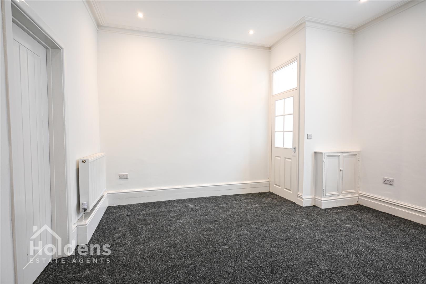 UPVC double glazed window to front, radiator, recessed spotlights, decorative fireplace, built in storage cupboard, door into kitchen/diner.