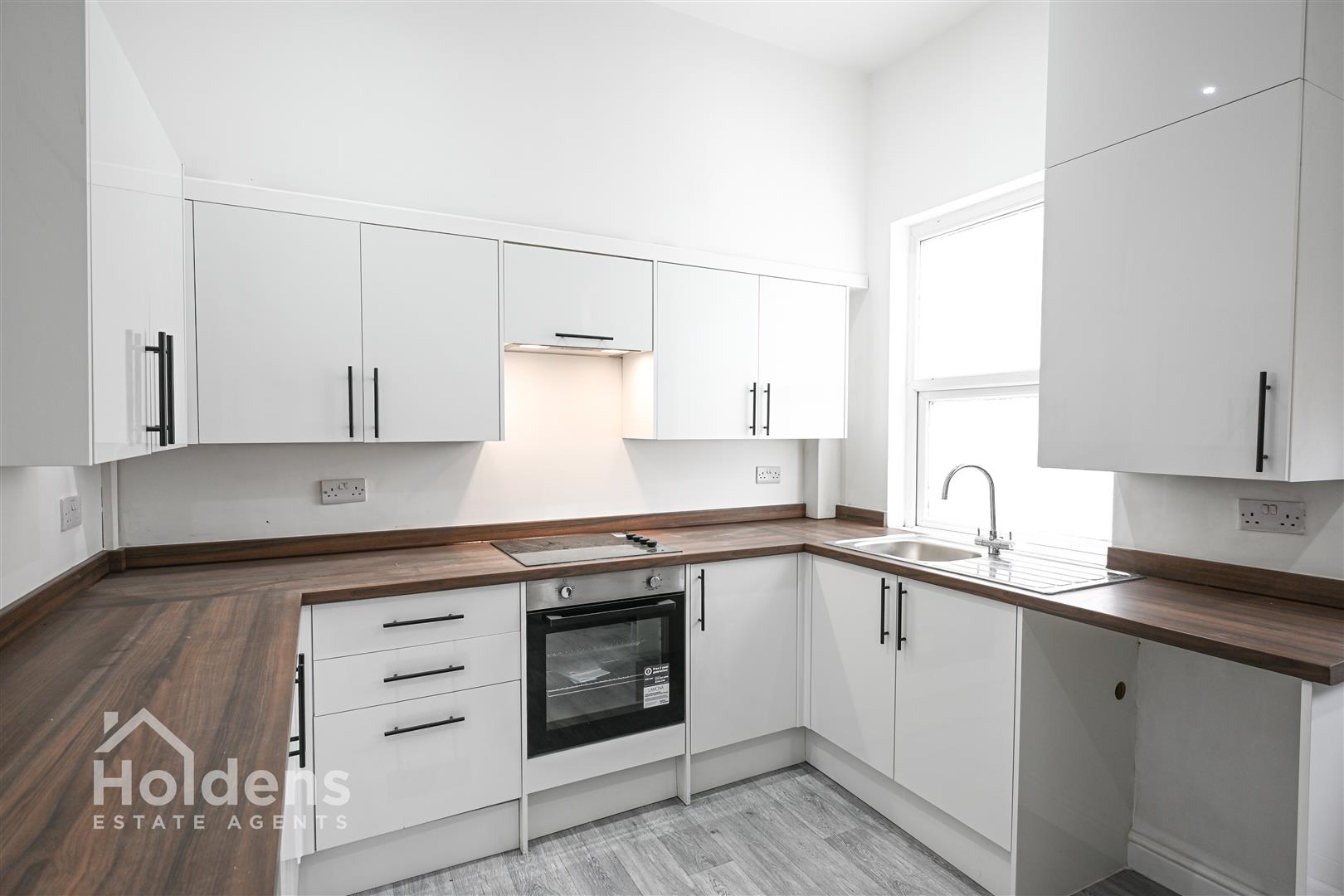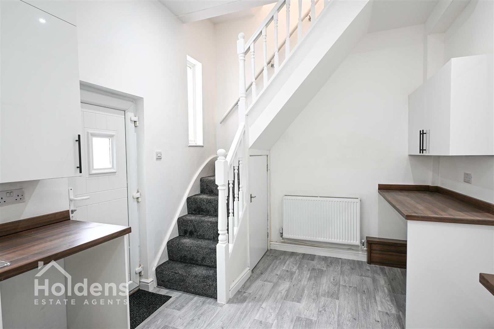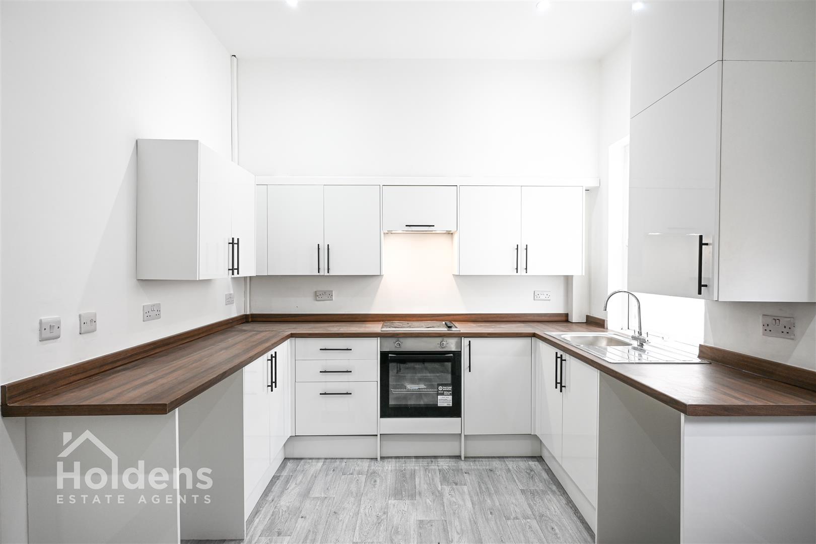 UPVC double glazed windows and door to rear, laminate flooring, radiator, recessed spotlights, modern walls and base units with contrasting worktops, integrated four ring electric hob and oven with overhead extractor fan, stainless steel sink with single drainer, space for washing machine, space for under countertop fridge & freezer, wall mounted combi boiler, stairs to first floor.