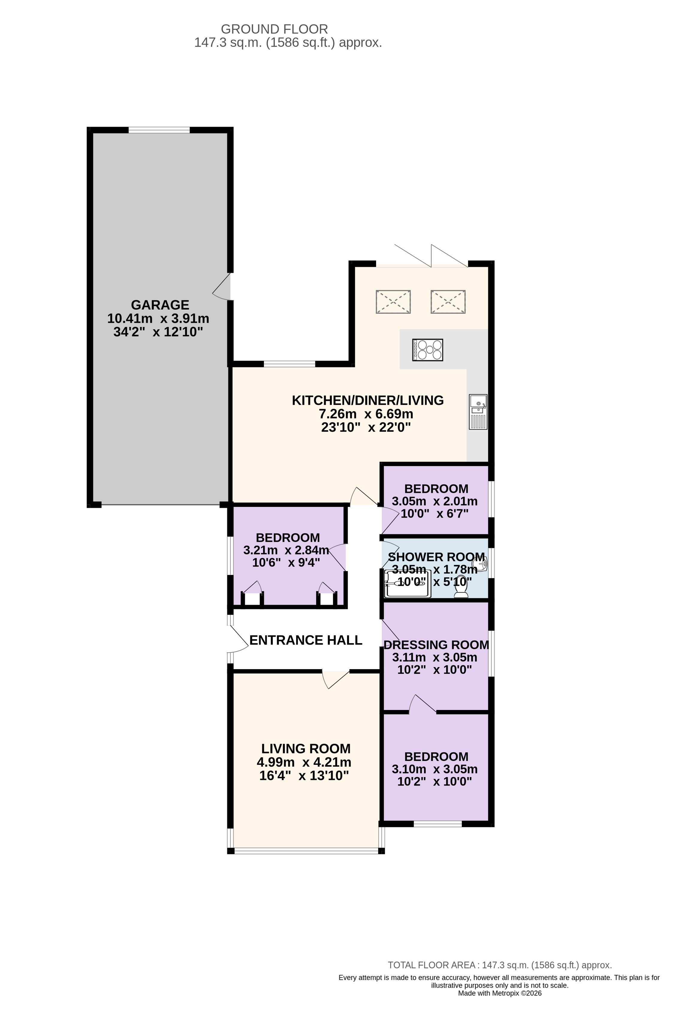Welcome to this spacious and inviting four bedroom detached true bungalow, which offers a fantastic opportunity for anyone seeking a superb family home in a convenient location. As you step inside, you’ll immediately notice the generous living room, perfect for relaxing with the family or entertaining friends. The heart of the home is the modern kitchen, which flows seamlessly into a versatile diner and family room space, creating a welcoming environment for both every-day life and special occasions. There are three well-proportioned bedrooms, each offering a comfortable retreat at the end of the day, plus a dedicated dressing room that could easily double as a fourth bedroom or a handy home office, depending on your needs. The stylish shower room is ideal for busy mornings, with contemporary fittings that add a touch of luxury to your daily routine. The property also benefits from ample driveway parking and a tandem garage, providing plenty of space for vehicles, storage or even a workshop area if you’re feeling creative. The location is incredibly convenient, with easy access to major motorway links, making commuting or travelling further afield a breeze. This home really does tick all the boxes for growing families or those looking to downsize without compromising on space and comfort. Viewing is essential to truly appreciate everything this special bungalow has to offer, so don’t miss your chance to make it yours.