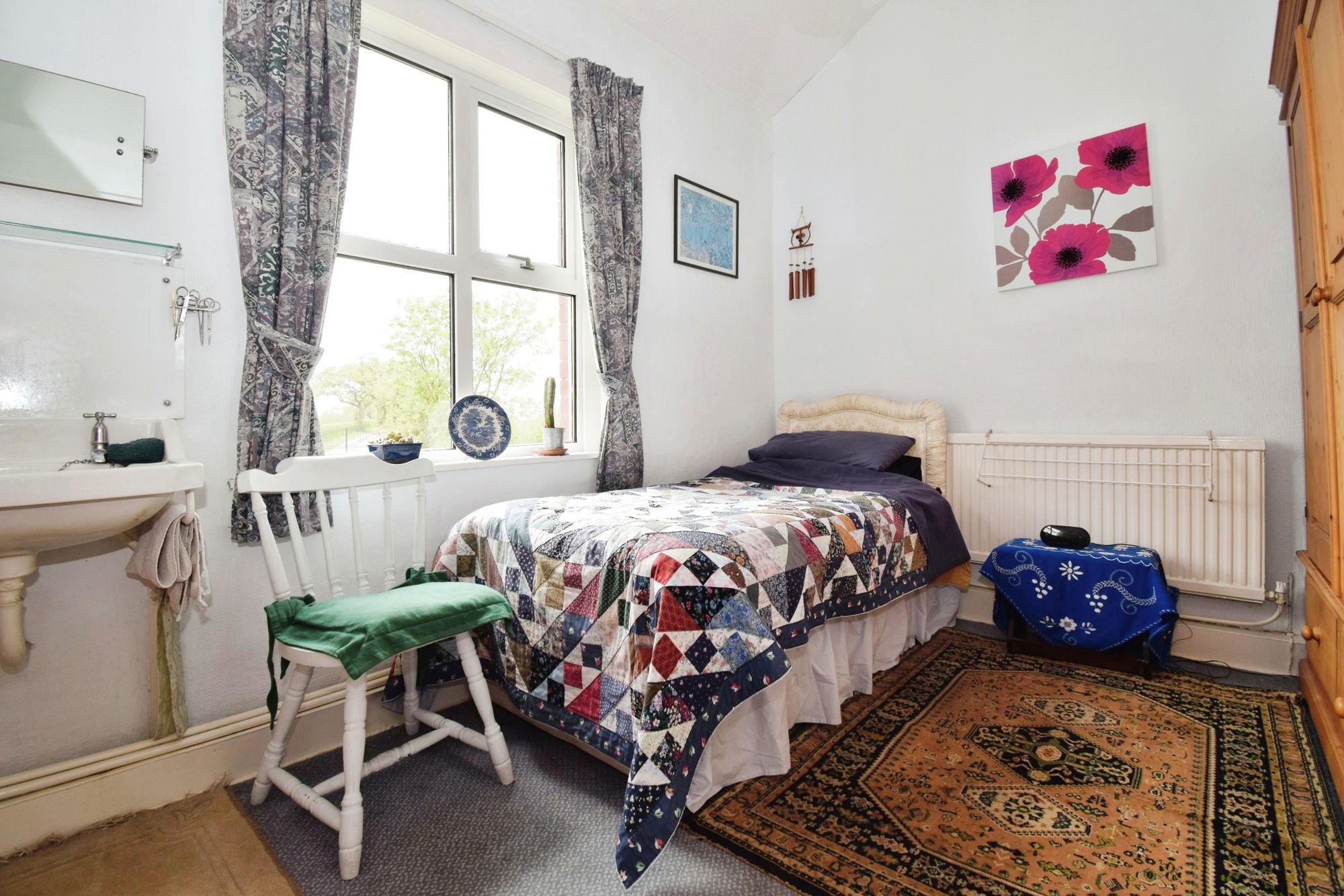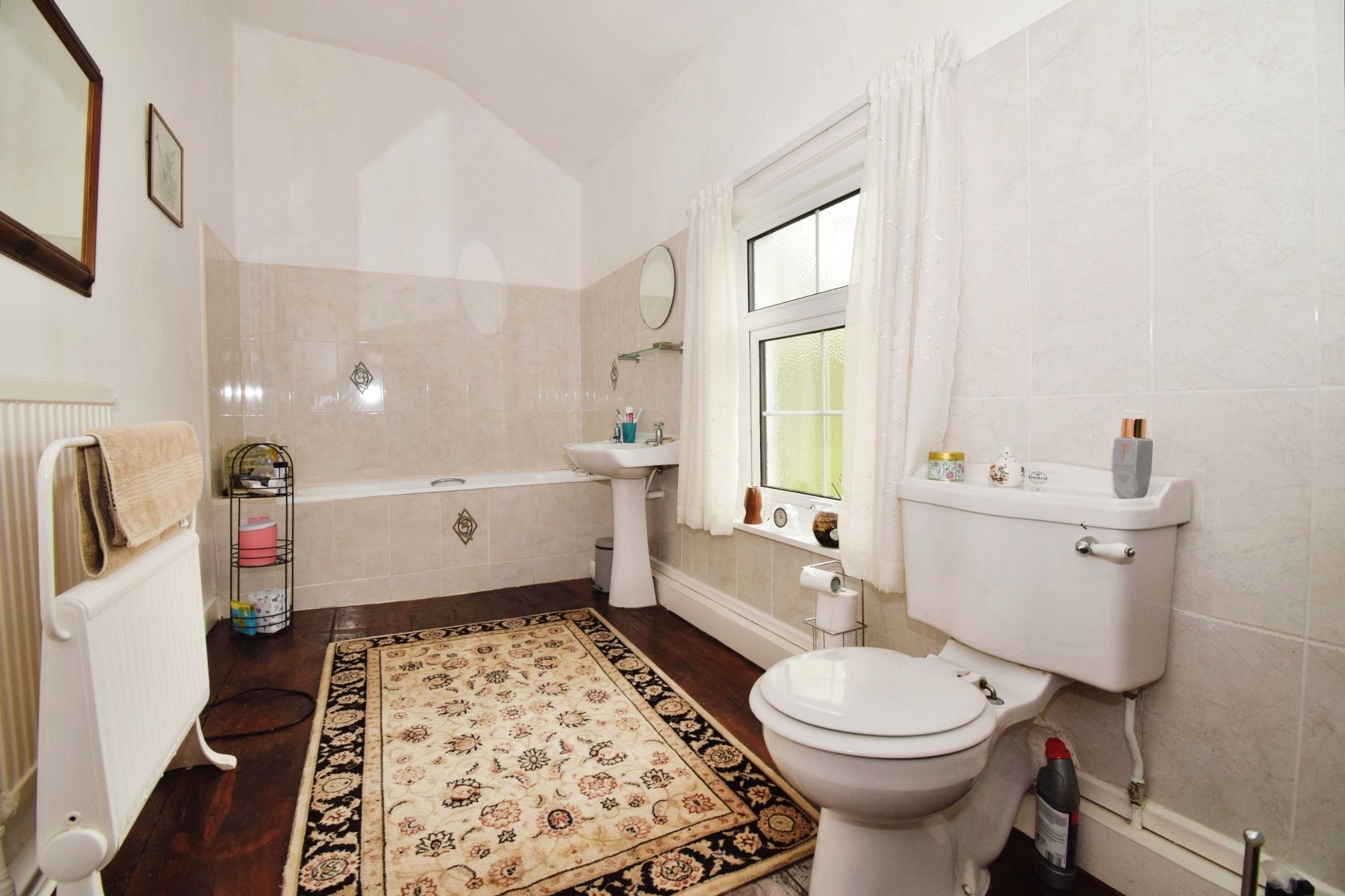 uPVC double glazed windows to rear, radiator, wooden floor, sink with pedestal, bath, WC.