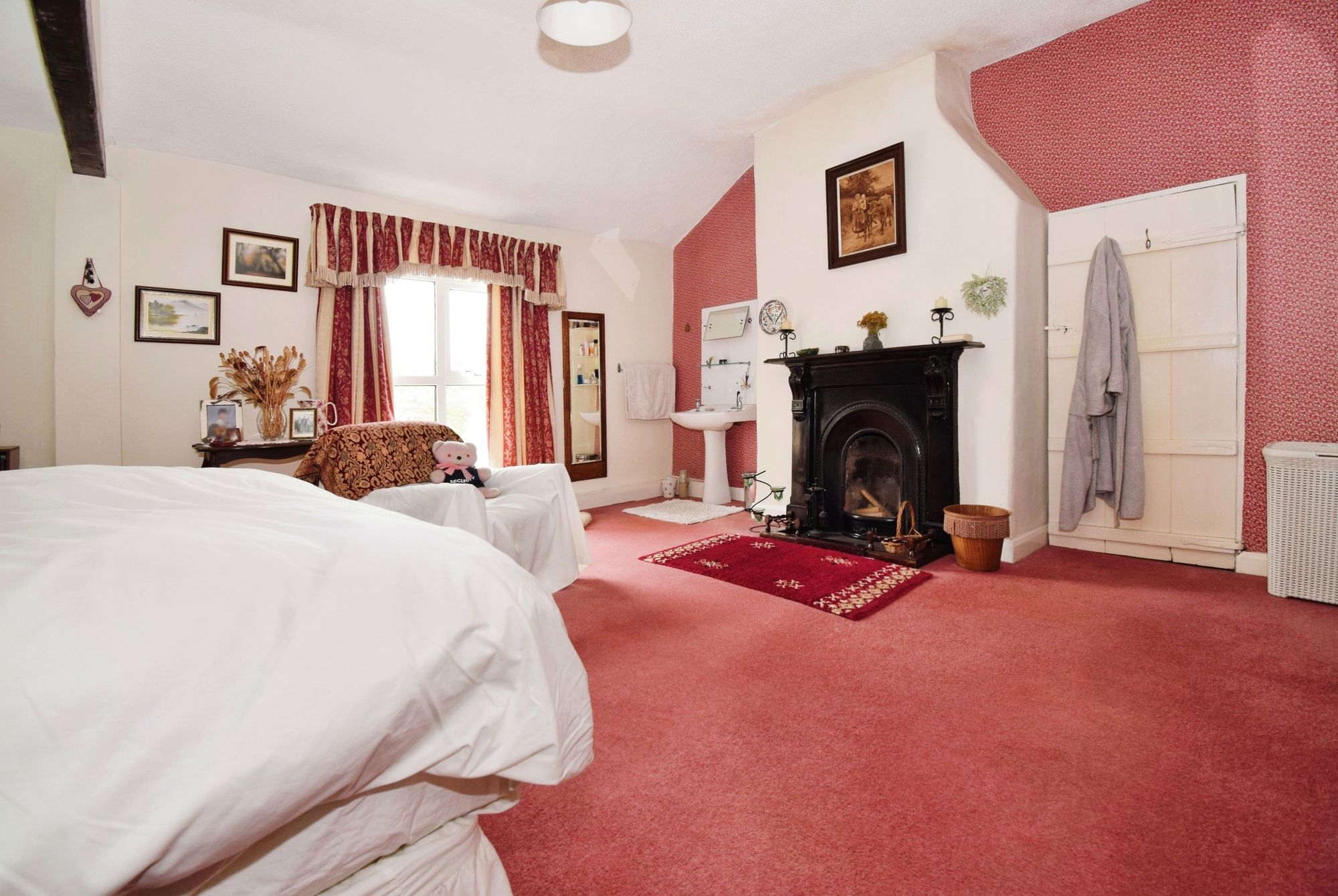 uPVC double glazed windows to front, radiator, fireplace, sink with pedestal and built-in shelf and mirror, wooden beam.