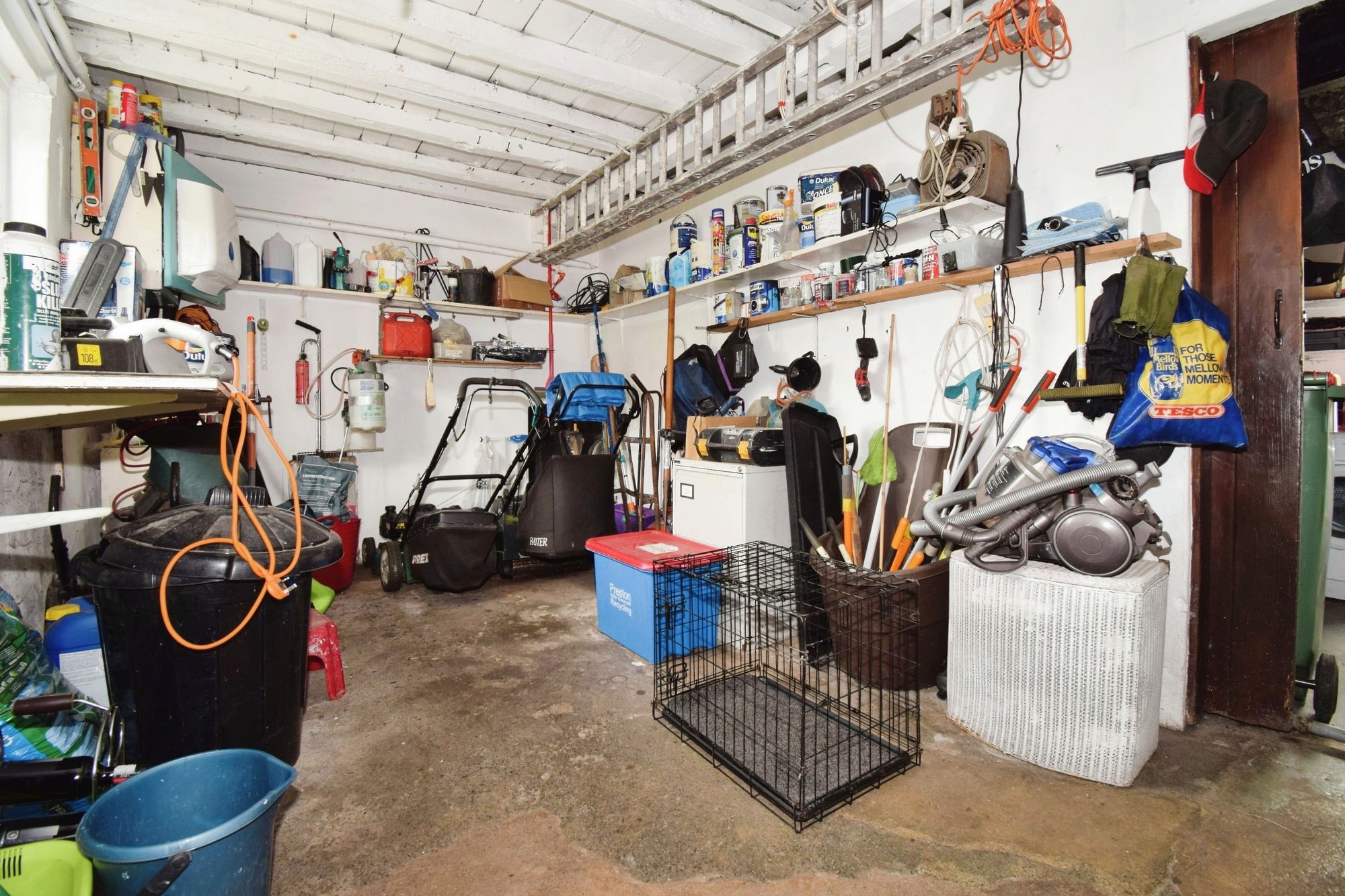 Plumbing for washing machine, built-in shelves, wall mounted cupboard, ladder into attic, door to shed, concrete floor.
