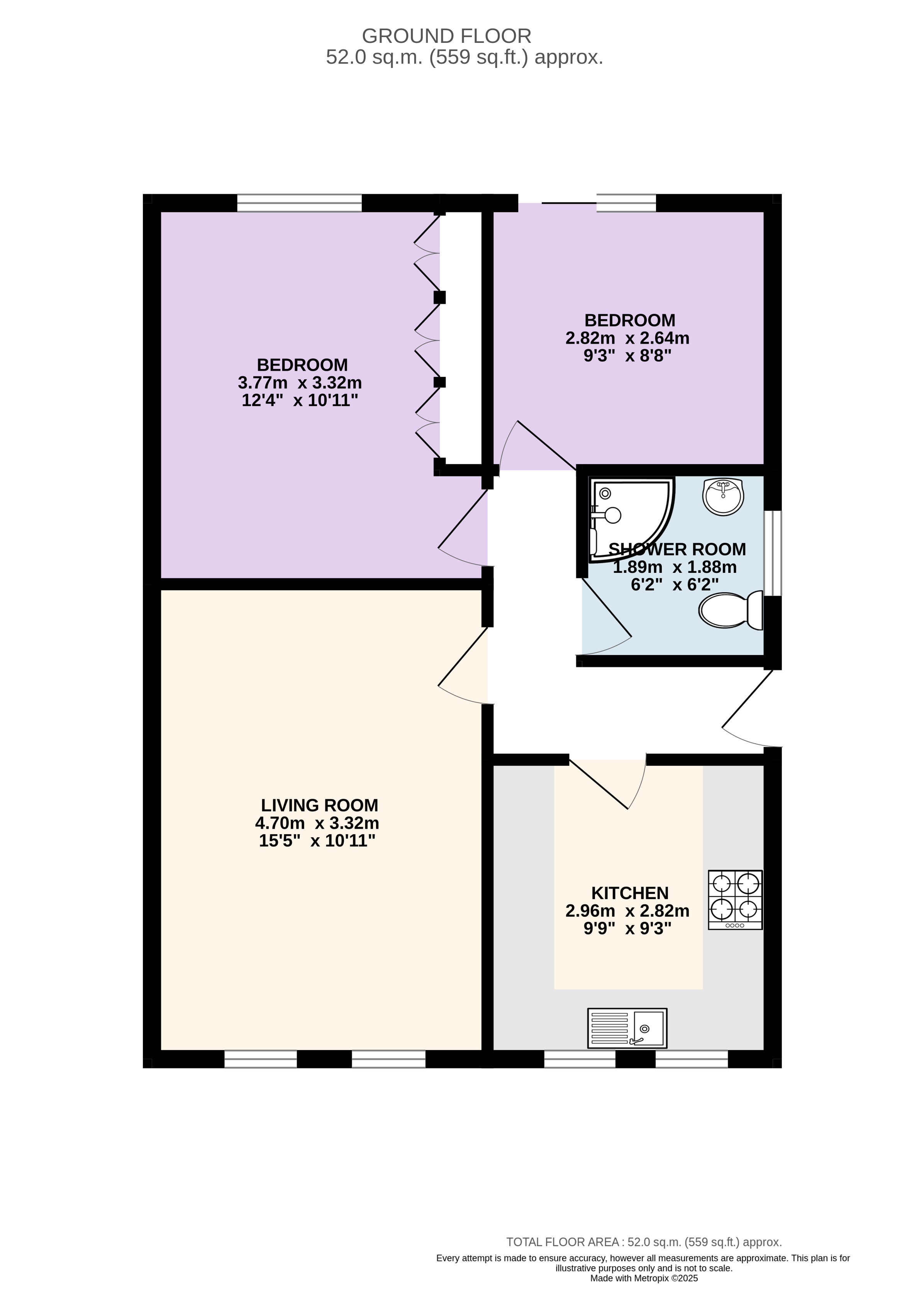 The accommodation briefly comprises: a welcoming entrance hall, a spacious front-facing living room, and a fitted kitchen. Continuing through the property, you’ll find a modern shower room and two well-proportioned bedrooms positioned to the rear.